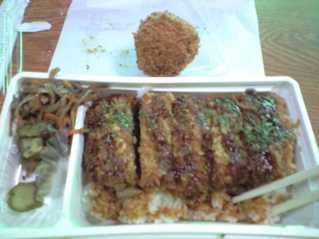 松坂屋の神戸屋の和牛勝重とチーズコロッケを席亭と女将さんと三人でたべる♪すき焼き風ご飯味付けにしゃぶしゃぶ肉かカツになって絶妙な旨さ♪