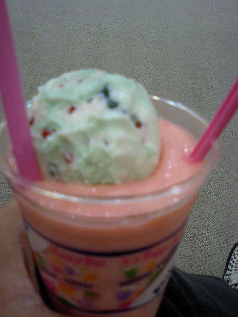 グアバスムーズの上アイスには懐かしのパチパチパンチキャンディ入り!!。