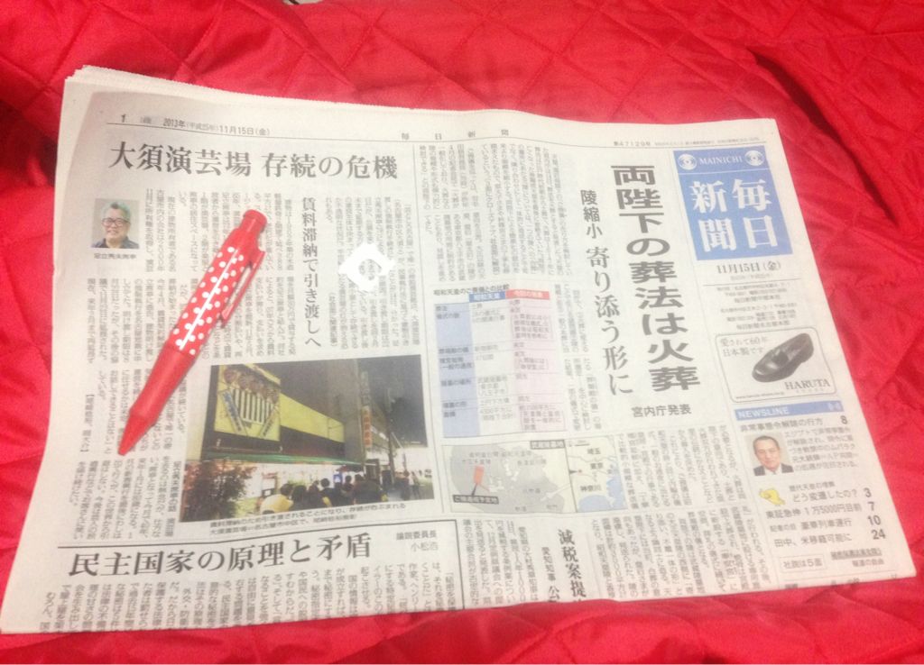 新聞の見出しみて海演隊ピンク古池ちゃんは、お席亭が首くくってないか心配ですっ飛んできたらしい…。by女将さん談。しかし、 存外 、秀夫席亭曰く「天皇陛下様の記事同列上に己の記事写真んでしまったゾ!額にいれて飾らなん」と上機嫌との情報をば某前座から事前に仕入れてたので今朝、大阪行く前にロビーでお席亭の顔見るなり「よっ!陛下‼」っていったらばまんざらでもないご様子。まあ、カラ元気かもしれんけどネ。