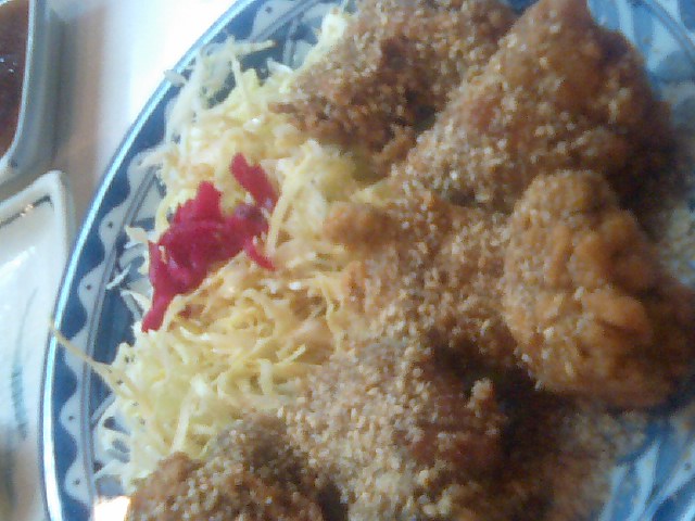 まるで鶏肉みたいな食感なぁじなど色んな食感の部位が味わえそれや臭みを、美味しい衣がナイスフォローしてるしキャベツもくどさを緩和してナイスアシスト