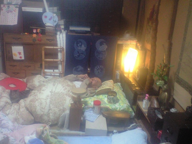 おじーの部屋(自作の家具に囲まれごちゃごちゃな)で寝ておじーのいびきや