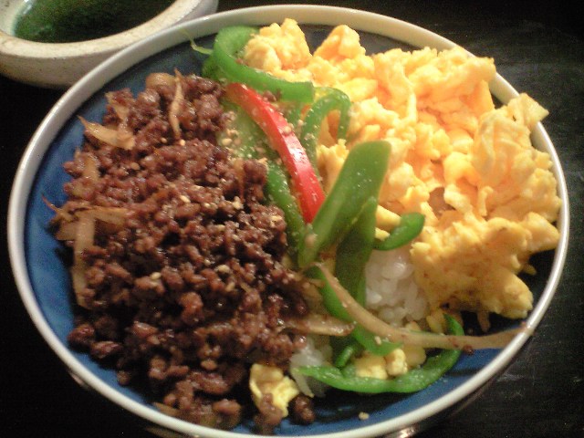 「月」のランチいつもの弁当かカレーで迷ってたらば、土曜は弁当はなくてそぼろ二色丼との事でぇ
